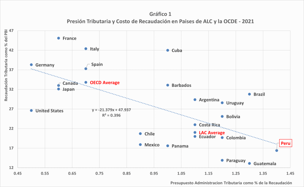 Los sistemas tributarios son la columna vertebral de los ingresos que los gobiernos requieren para financiar sus gastos, redistribuir el ingreso y estabilizar sus economías. Las principales métricas utilizadas para evaluar los sistemas tributarios son a) la relación entre los ingresos tributarios y el PBI (recaudación obtenida por cada 100 soles de PBI) y b) el costo de la administración tributaria como porcentaje de los ingresos tributarios (costo de recaudar 100 soles). Mientras que el primero refleja la capacidad de los gobiernos país captar los recursos que requieren, el segundo indica la eficiencia con la que se recaudan esos recursos. En esta entrega exploramos la relación entre estos dos indicadores en los países de América Latina y el Caribe (ALC) y las economías de la OCDE, revelando diferencias estructurales, desafíos institucionales e implicaciones políticas.