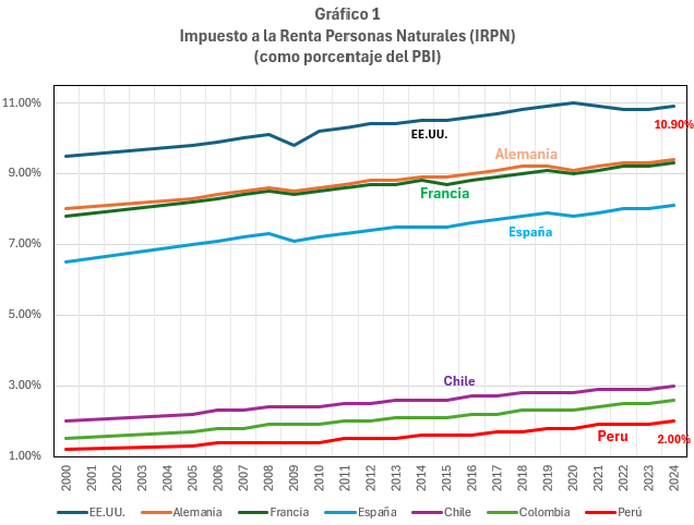 El IRPN en el Perú presenta serias limitaciones en términos de equidad, eficiencia y capacidad recaudatoria. Este impuesto recauda apenas 2.0% del PBI, muy por debajo de los estándares internacionales y latinoamericanos (ver Gráfico 1). La principal razón de la baja recaudación es la alta informalidad laboral que excluye a millones de contribuyentes potenciales. La solución a este problema requiere de una reforma tributaria integral que articule de manera holística la política tributaria con la administración tributaria de este impuesto.