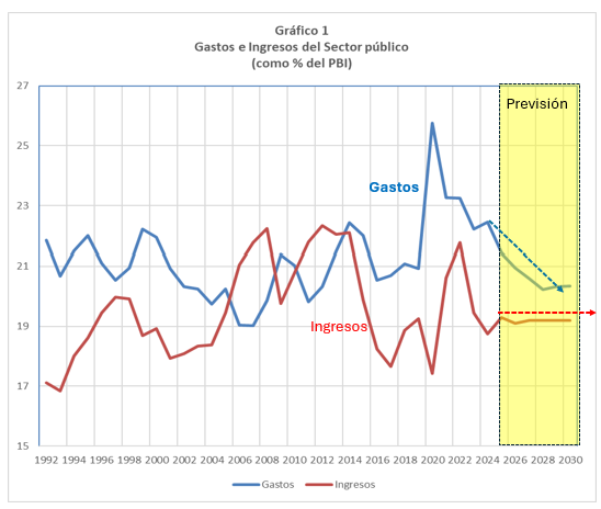 Por el lado de los ingresos el MMM proyecta mantener su participación en 19% del PBI para todo el periodo de análisis (ver Gráfico 1). Aunque el MMM reconoce que los ingresos tributarios están por debajo del promedio regional y de los niveles prepandemia, no plantea una reforma tributaria integral. Las proyecciones para 2025 se basan en ingresos extraordinarios —como la venta de una empresa eléctrica y una regularización tributaria excepcional— que difícilmente se repetirán.