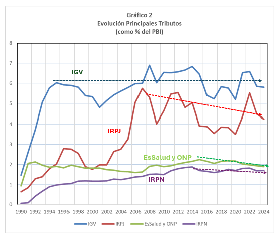 En el Gráfico 2 se presentan la evolución de los principales tributos como porcentaje del PBI para el periodo 1990 — 2024. En el caso del IGV (en azul) sus niveles se encuentran por debajo de los niveles registrados 1997. La introducción de la facturación electrónica por la SUNAT parece no haber tenido efecto sobre la recaudación y su deterioro se explica por la informalidad propiciada por el creciente contrabando alimentado por el narcotráfico, la minería ilegal y otras actividades ilícitas.