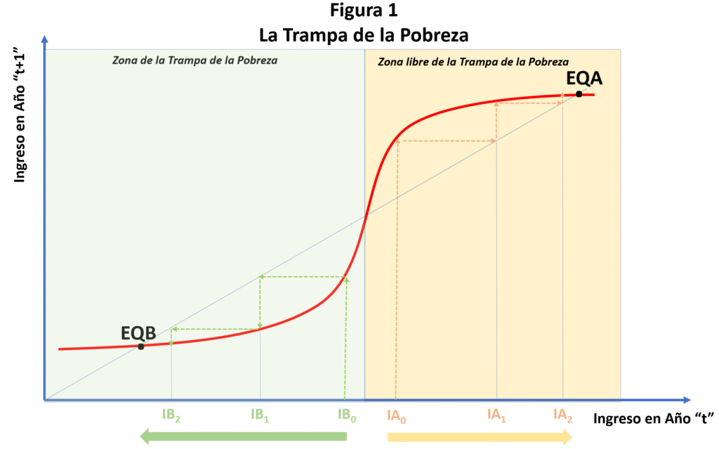 La Figura 1 grafica los ingresos de un año como función de los ingresos del año anterior. Por ello, la línea diagonal representa los casos donde los ingresos de hoy son iguales a los de ayer. Para los muy pobres, que se encuentran en la zona de la trampa de la pobreza, los ingresos futuros son inferiores a los actuales por la falta de ahorro que les permita invertir en capital y, por ello, la curva S (que representa el recorrido de los niveles de ingreso a lo largo del tiempo) está por debajo de la línea diagonal. Esto significa que, con el tiempo, quienes se encuentran en esta zona se vuelven cada vez más pobres, y eventualmente, terminarán atrapados en la pobreza, en el punto EQB. Para quienes comienzan fuera de la zona de la trampa de la pobreza, los ingresos de hoy son superiores a los de ayer y, por ello, cada se vuelven vez más ricos, encontrando eventualmente un equilibrio en el punto EQA.
