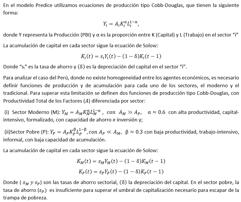 La simulación de la acumulación de capital (mayor ahorro) y el aumento de la productividad utilizando el modelo PREDICE ha permitido observar cual sería la evolución del capital per cápita y el incremento de la productividad en ambos sectores durante un período de diez años. Los supuestos incluyen el redireccionamiento del gasto social como fracción del producto del sector moderno y ponderado por la población en el sector pobre, implementado mediante la relocalización de los programas asistencialistas y del Canon minero. Además, se contempla una política de inclusión financiera que incrementa la tasa de ahorro del sector pobre, ofreciendo tasas de interés competitivas para pequeños ahorristas y otorgando billeteras electrónicas a las poblaciones de menores ingresos. La retroalimentación del gasto social eleva la Productividad Total de Factores del sector pobre.