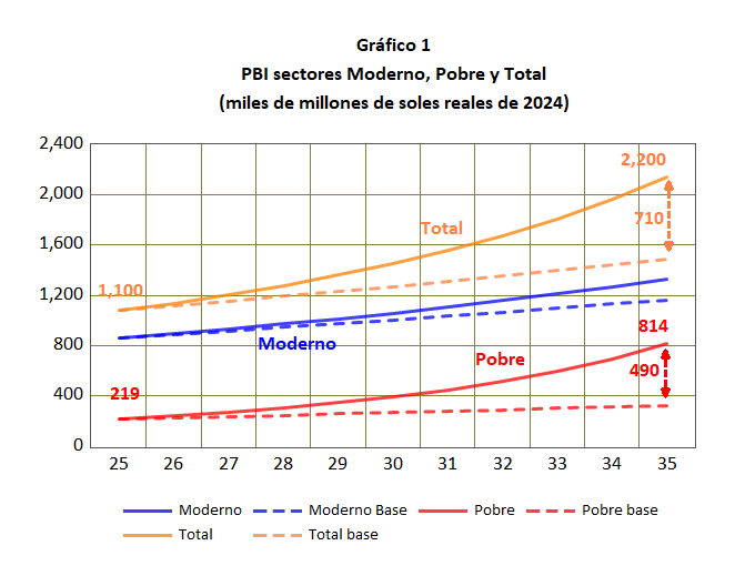 Al analizar por separado el sector moderno y el pobre, se puede apreciar el enorme impacto que puede tener el aumento de la productividad y la tasa de ahorro del sector pobre. Es urgente priorizar reformas orientadas a aumentar la inclusión financiera (fomento del ahorro), la formalización productiva, la educación técnica y la masiva extensión agrícola en las zonas con alto índice de pobreza. Además, es necesario una reasignación estratégica del gasto social, pasando de programas de alivio como Juntos o el uso ineficiente del Canon minero hacia instrumentos de inversión en capital humano y físico del sector pobre.