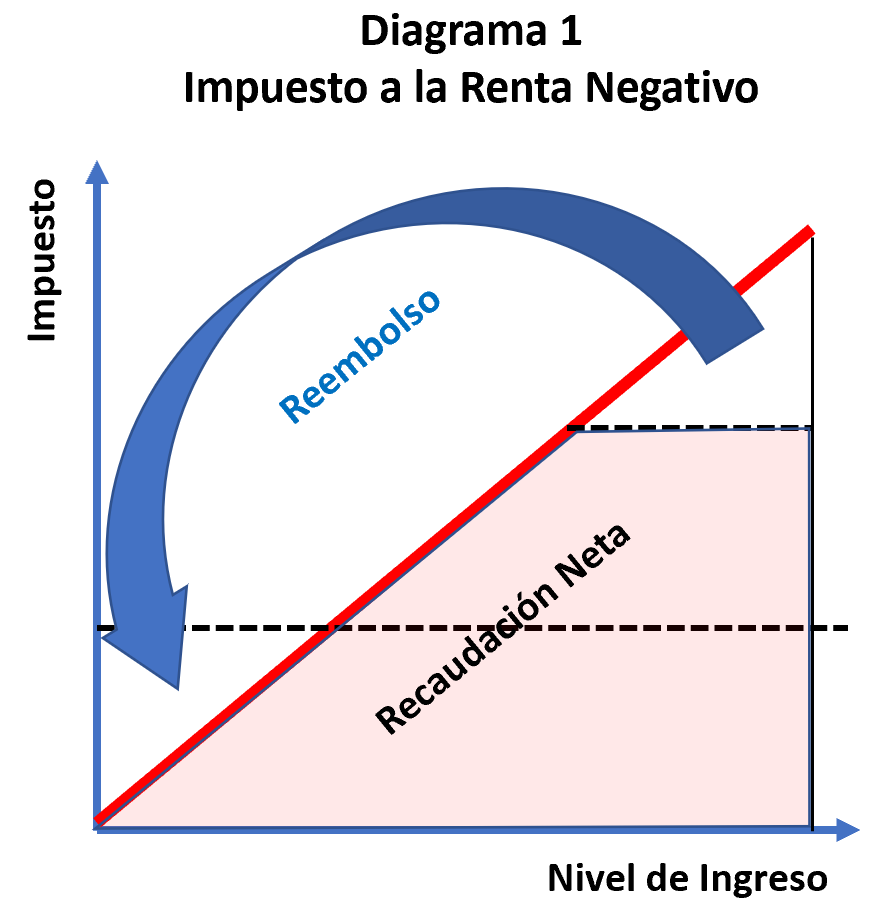 El esquema funciona así: todos los ciudadanos en edad de trabajar pagan un impuesto mínimo universal —por ejemplo, S/ 60 mensuales— que los obliga a declarar sus ingresos. Quienes ganan por encima de un umbral definido, pagan impuestos adicionales; quienes ganan por debajo, reciben una transferencia del Estado, equivalente a un porcentaje de la diferencia entre su ingreso y el umbral (ver Diagrama 1).