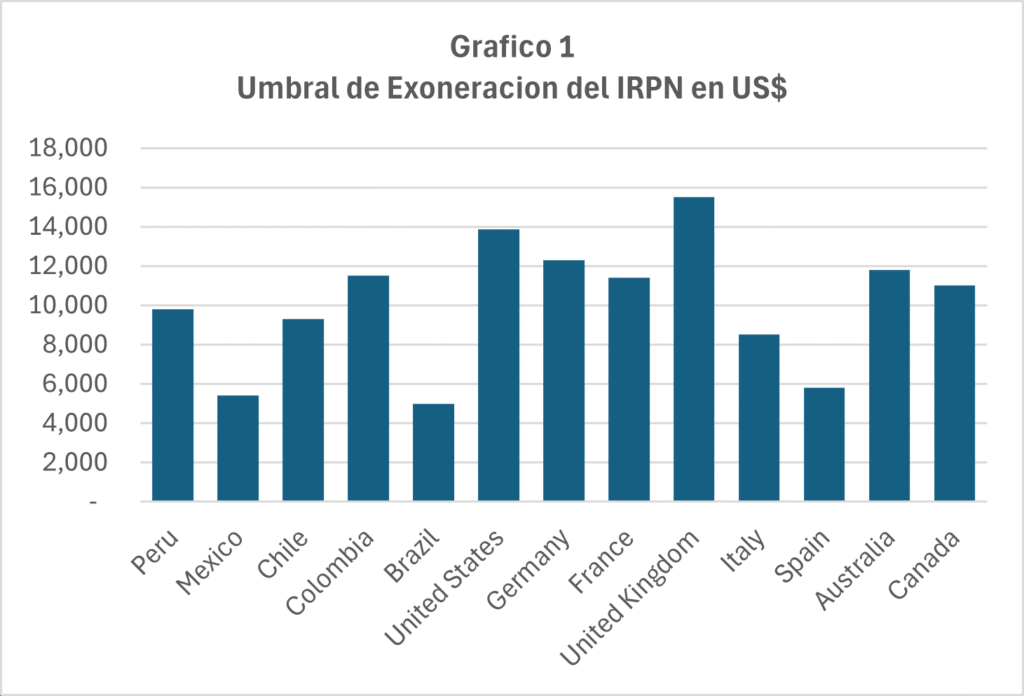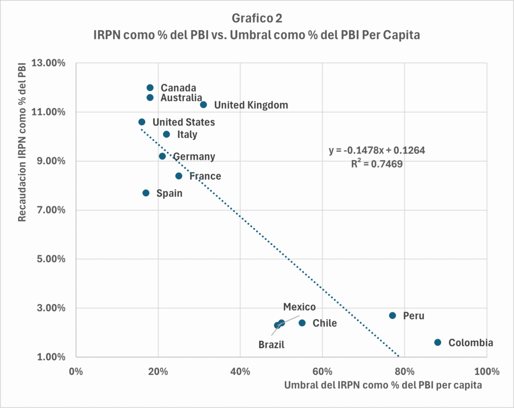 La principal razón es el alto umbral de exoneración. En términos absolutos, el Perú tiene un “threshold” de alrededor de 9,800 dólares anuales (ver Gráfico 1), comparable al de países desarrollados con ingresos per cápita tres o cuatro veces superiores. Esto significa que una gran proporción de trabajadores formales y de trabajadores independientes no paga impuesto a la renta, reduciendo drásticamente la base tributaria.