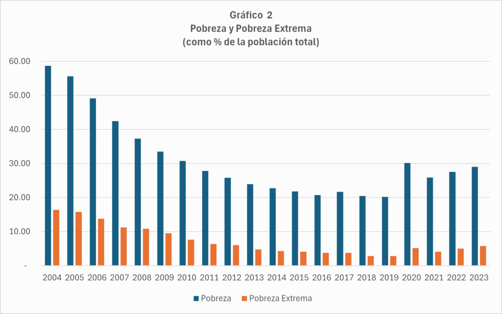 En efecto, desde el 2001 hasta el 2012 (ver Gráfico 1) , salvo una corta interrupción por la crisis financiera mundial, el Perú vivió un “superciclo” de materias primas que permitió reducir la pobreza de manera significativa. Millones de personas salieron de la pobreza extrema gracias a transferencias condicionadas, subsidios y un mercado laboral más dinámico. Sin embargo, a pesar de que el ciclo se ha reiniciado con mayor intensidad a partir del 2016, alcanzando niveles nunca antes alcanzados, el crecimiento del PBI se ha desacelerado significativamente respecto a décadas pasadas, y la reducción de la pobreza se ha revertido, a pesar del aumento de los programas de transferencias y subsidios (ver Gráfico 2).