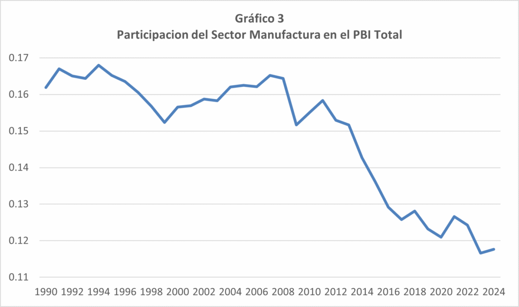 La dependencia de los precios internacionales y la ineficiencia y corrupción del manejo de los recursos fiscales aunada a la retracción de la inversión ha motivado que la economía se desacelere y la pobreza volviera a aumentar. Los beneficios se concentraron en regiones mineras o petroleras, mientras amplias zonas rurales quedaron rezagadas. Además, los encadenamientos productivos fueron escasos: la minería, por ejemplo, genera empleo directo limitado y no siempre impulsa industrias locales de alto valor agregado. El “trickle down” ha funcionado parcialmente, ya que no ha logrado transformar la estructura productiva (ver Gráfico 3), no ha logrado desaparecer la pobreza, ni garantizar igualdad de oportunidades a largo plazo que se ha traducido en un aumento de la informalidad laboral y de la violencia social.