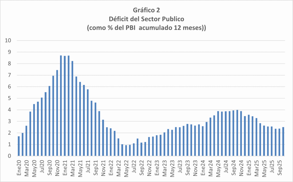 El déficit fiscal, que ya bordea el 2.5% del PBI y podría superar el 3% en 2026, enfrenta presiones crecientes (ver Gráfico 2). El Congreso impulsa leyes de corte populista, que incrementan el gasto corriente y limitan la recaudación tributaria, mientras que el servicio de la deuda pública se encarece con el aumento de las tasas de interés. A ello se suma la situación crítica de Petroperú, cuya eventual necesidad de rescate financiero podría añadir varios puntos al déficit fiscal. La sostenibilidad fiscal, uno de los pilares de la credibilidad macroeconómica del país, se encuentra en riesgo. El reemplazo del Presidente de Petroperú es una señal positiva respecto a la actitud del MEF y el MINEM sobre su futuro.