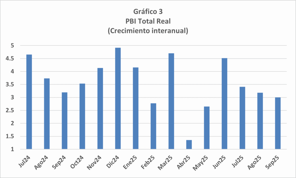 El alza internacional del oro y del cobre ha generado un superávit comercial que sostiene la balanza de pagos. Sin embargo, la minería ilegal del oro y el contrabando en el sur del país no solo erosionan la recaudación fiscal, sino que alimentan redes criminales que intensifican la violencia y que podrían influir en el resultado de las elecciones. El sicariato y la extorsión, que afectan al transporte y a las pequeñas empresas, reducen la productividad y elevan los costos de operación. En paralelo, la campaña electoral y la fragmentación política desalientan la inversión privada, que ya muestra señales de desaceleración, de cara a 2026. El resultado será un crecimiento que podría mantenerse en torno al 3% en 2025, pero con riesgo de caer a 2.5% en 2026 si la violencia se generaliza y la incertidumbre política se profundiza (ver Gráfico 3).