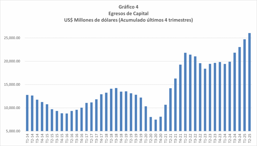 Uno de los factores más críticos es la fuga de capitales, iniciada con la asunción de Pedro Castillo a la presidencia en 2021. Desde entonces, más de 20.000 millones de dólares por año vienen saliendo del país (ver Gráfico 4), reflejando la desconfianza de inversionistas frente a la inestabilidad política y la debilidad institucional.