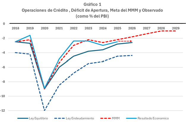 En los últimos años, los déficits de apertura aprobados en las Leyes de Equilibrio Financiero han sido superiores a los niveles fijados en los Marcos Macroeconómicos Multianuales (MMM). Esta situación ha motivado que las metas fiscales inicialmente planteadas no se cumplan o que, en algunos casos, se hayan tenido que modificar las disposiciones de la Ley de Transparencia y Responsabilidad Fiscal. Como consecuencia, las trayectorias de convergencia del déficit fiscal hacia el 1% del PBI y de la deuda pública hacia niveles sostenibles han sido reajustadas en varias ocasiones, reflejando la tensión entre las necesidades de financiamiento inmediato y los compromisos de sostenibilidad de mediano plazo.