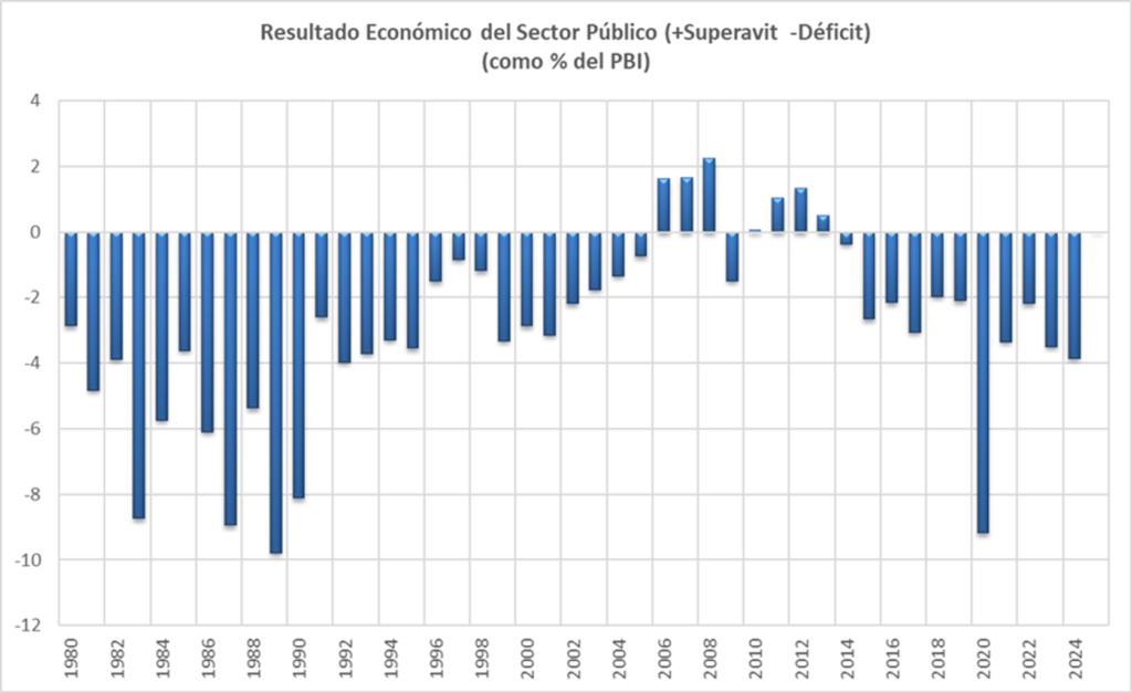 En el Gráfico 2 se presenta la evolución del Resultado Económico del Sector Público para el periodo 1980 – 2024. Durante los años ochenta, el Perú enfrentó una de las peores crisis económicas de su historia, marcada por la hiperinflación durante el primer gobierno de Alan García. El sector público acumuló déficits fiscales insostenibles que se financiaron con emisión monetaria, lo que erosionó la credibilidad del Estado, generó una hiperinflación, y llevó a una contracción severa de la economía.