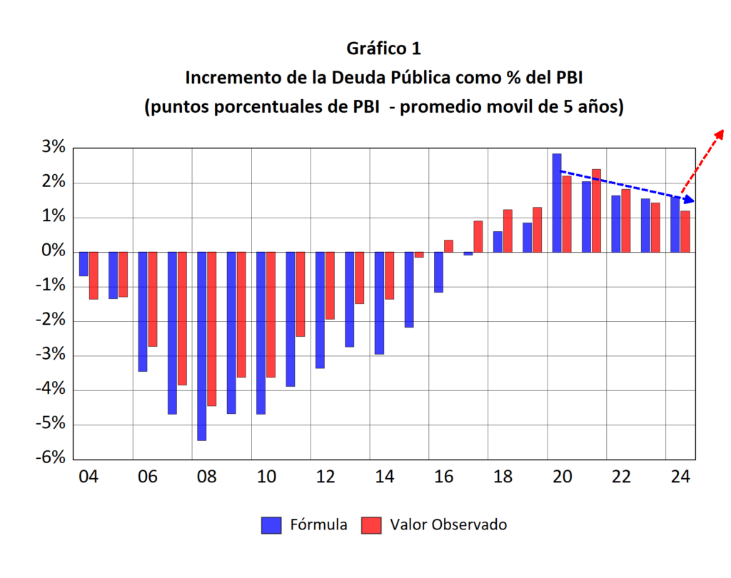 En el Gráfico 1, observamos que el incremento de la deuda pública como porcentaje del PBI mostró una tendencia descendente (tasas negativas) hasta 2008, marcada por la crisis financiera global. Desde 2009, esa reducción se volvió menos pronunciada y, a partir de 2016, la deuda comenzó a crecer, y su crecimiento se intensificó con la pandemia. Este aumento sostenido persiste hasta hoy, y según la fórmula estándar de la dinámica de la deuda, se proyecta que esta continuará incrementándose a un ritmo aproximado de dos puntos porcentuales del PBI por año.