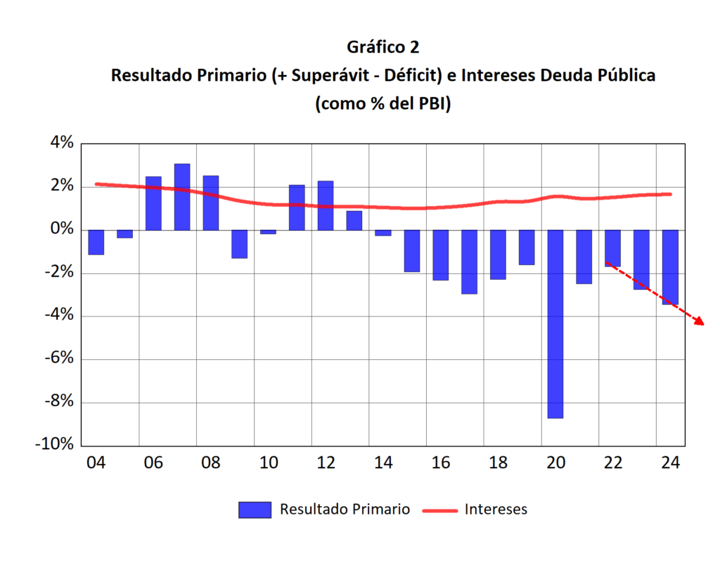 Un país con pago de intereses de la deuda pública creciente requiere generar superávits primarios lo suficiente mente holgados como para pagar la cuenta de los intereses. Lamentablemente en nuestro país, los intereses están aumentando y el déficit primario también (ver Gráfico 2), es decir estamos iniciando un ciclo vicioso, más déficit, más deuda, más intereses, más déficit.