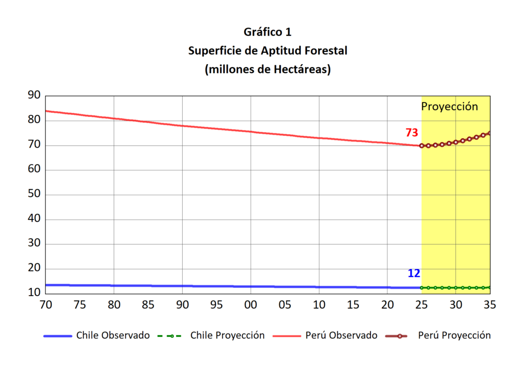 El contraste con el Perú es elocuente. A pesar de contar con una superficie apta para actividades forestales muy superior a la chilena, la evolución de la superficie forestal en producción ha sido lenta, errática y marginal. Durante décadas, el país no logró traducir su abundancia de bosques amazónicos ni el enorme potencial forestal de la sierra en una base productiva formal. Como resultado, hacia 2025 la superficie forestal efectivamente manejada para producción en el Perú sigue siendo muy inferior a la de Chile, pese a disponer de decenas de millones de hectáreas con aptitud forestal.