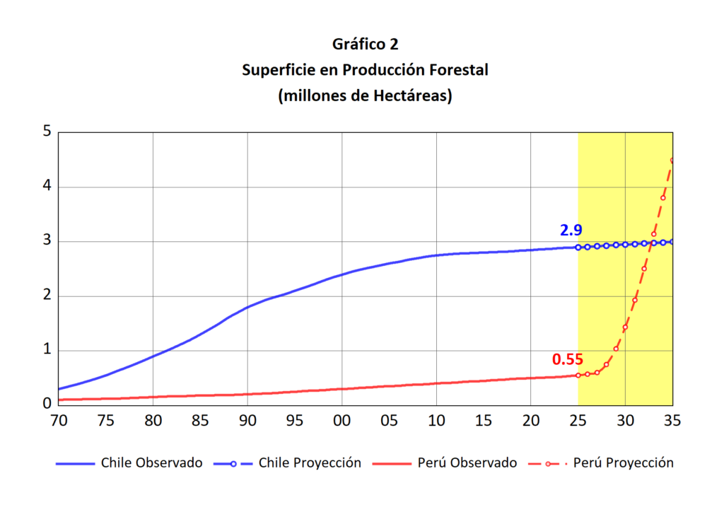 La superficie en producción forestal de Chile y Perú