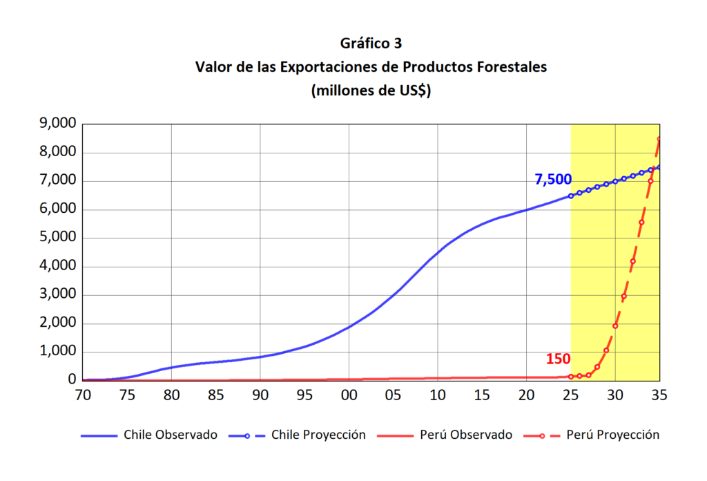 Paradójicamente, esta situación implica que el potencial de crecimiento exportador del Perú es significativamente mayor al de Chile. A diferencia de este último, el Perú no enfrenta límites territoriales estrictos para expandir su superficie forestal en producción. Si se implementaran políticas adecuadas —incluyendo un programa masivo de forestación y reforestación, seguridad jurídica, formalización, infraestructura y desarrollo industrial— el país podría expandir rápidamente su base productiva y, con ello, sus exportaciones forestales. En un horizonte de diez años, el Perú no solo podría multiplicar varias veces sus exportaciones actuales de productos forestales, sino superar los niveles de exportaciones forestales que hoy alcanza Chile, aprovechando su enorme dotación de tierras aptas para la actividad forestal.