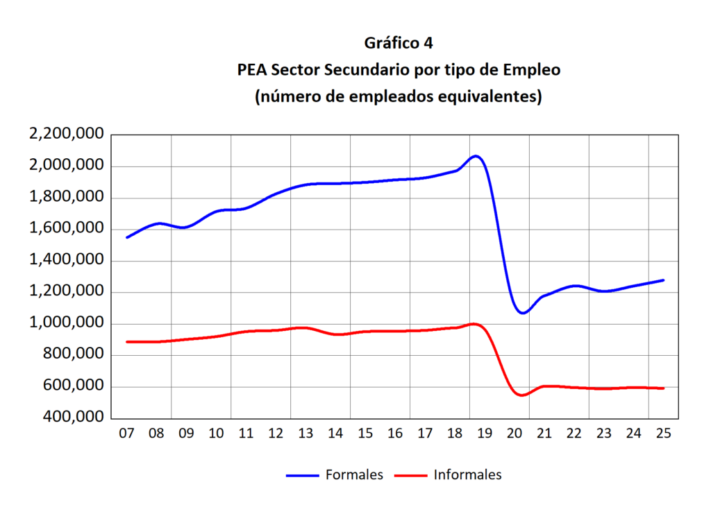 Incluso antes de la pandemia, el sector secundario (manufactura, construcción y Electricidad, Gas y Agua) mostraba señales de debilitamiento. La participación de la manufactura en el empleo total se reducía progresivamente, afectada por la apreciación del tipo de cambio real asociada al boom minero y por la competencia del contrabando y de productos importados de bajo costo. Este fenómeno, conocido como enfermedad holandesa, encareció la producción local y debilitó la competitividad de la industria nacional.