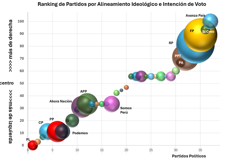 Ese deterioro explica buena parte de la polarización política contemporánea. Los ciudadanos dejan de confiar en las instituciones, se refugian en identidades tribales y castigan a las élites que consideran oportunistas. La política se convierte en un campo de batalla emocional, no en un espacio de diseño institucional. La actual campaña electoral es un claro ejemplo de este escenario. El gráfico adjunto ilustra como los partidos políticos se han polarizado entre las posiciones de izquierda que proponen mas Estado y las posiciones de derecha que proponen menos estado, menos regulación, más seguridad y más emprendimiento privado. Las encuestas de intención de voto muestran que los electores por un lado se han concentrado en partidos de derecha, pero por otro lado los partidos de izquierda si bien con un volumen electoral menor cuando considerados individualmente, si sumados en conjunto representan un contrapeso no despreciable a las posiciones de derecha. Lo que más llama la atención es el escaso volumen de intención de voto de los partidos que se pueden considerar de centro y revela la escasez de ideas alternativas a la derecha e izquierda. La polarización de los partidos políticos entre la izquierda radical y la derecha extrema, nos podría llevar a sorpresas en la segunda vuelta de las elecciones.