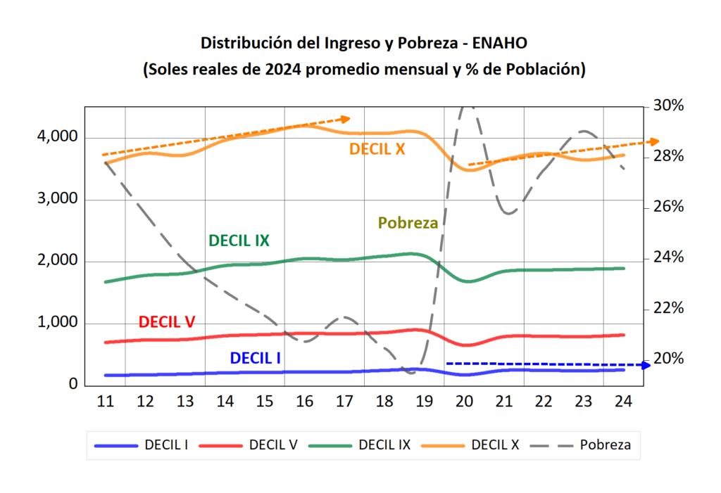 A partir de 2021 comenzó una recuperación lenta y desigual. En 2024, los niveles de pobreza aún se mantienen elevados y el ingreso promedio nacional apenas ha regresado a los niveles previos a la pandemia, pero la recuperación no ha sido homogénea. El decil X, que agrupa a los hogares de mayores ingresos, ha logrado recuperarse con mayor rapidez y profundidad que el decil I, el más pobre, a pesar de que este último recibe transferencias monetarias gubernamentales del programa Juntos. Esta divergencia revela que la recuperación económica ha beneficiado más a quienes ya tenían mejores condiciones para enfrentar la crisis. Los hogares de mayores ingresos pudieron adaptarse más rápidamente al teletrabajo, mantener sus actividades económicas o incluso aprovechar nuevas oportunidades surgidas durante la pandemia. En cambio, los hogares más pobres, dependientes de actividades presenciales e informales, enfrentaron mayores dificultades para recuperar sus ingresos.