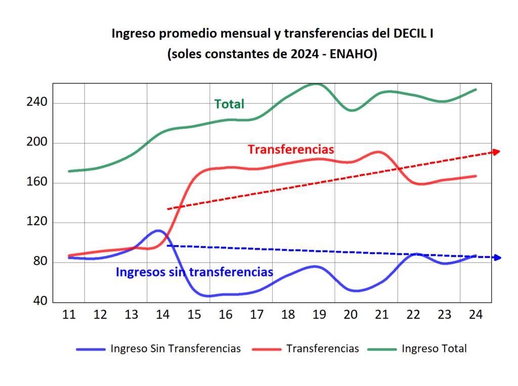 Cuando se descuenta el monto de las transferencias monetarias, el panorama se vuelve aún más preocupante. El ingreso neto del decil I apenas supera en 2.6% su nivel de 2011, lo que significa que, en términos reales, los hogares más pobres prácticamente no han mejorado su capacidad de generar ingresos propios en más de una década. En contraste, el monto de las transferencias del programa Juntos ha crecido más de 91.8% desde 2011.