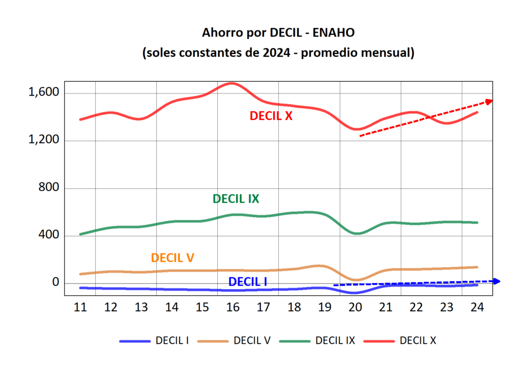 A esta evidencia se suma un indicador aún más revelador: el ahorro promedio por decil, obtenido como la diferencia entre los ingresos reales —incluyendo transferencias monetarias— y el gasto real reportado en la ENAHO. Los datos muestran que los deciles I y II no solo no tienen capacidad de ahorro, sino que presentan niveles de ahorro negativos durante prácticamente todo el periodo 2011–2024. En el decil I, por ejemplo, el ahorro real promedio mensual fue de –37.19 soles en 2011, –54.11 en 2015, –79.67 en 2020 y –12.96 en 2024.
