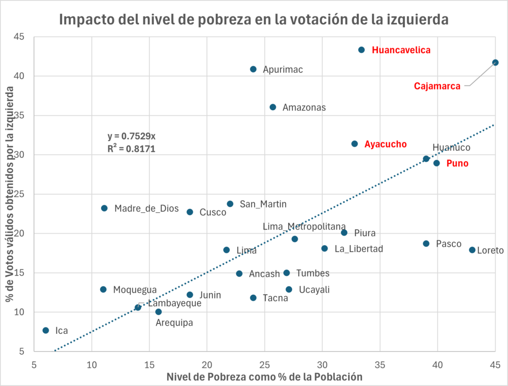 No es casual que estas mismas regiones sean también los bastiones electorales de las candidaturas de izquierda. La evidencia estadística muestra una correlación clara entre los niveles de pobreza y el porcentaje de votos válidos obtenidos por la izquierda en la primera vuelta electoral. Se trata de un electorado que, por razones económicas y sociales, se ha convertido en un voto cautivo. La pobreza no solo condiciona la calidad de vida, sino también las preferencias políticas, especialmente cuando los programas sociales se convierten en la principal fuente de ingresos estables para millones de hogares.